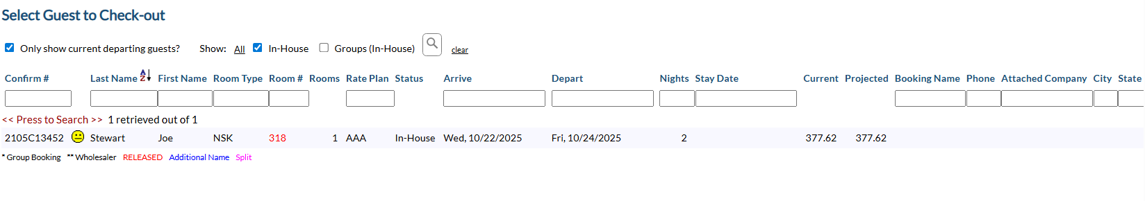 The Select Guest to Check-Out screen appears. By default, the screen shows all in-house guests scheduled for departure for the current system date alphabetically.