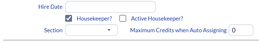 Maximum Credits when Auto Assigning: (Equivalent to Shift Points) If your Property is using the shift points method to assign rooms to housekeepers via credits, enter the number of credits to be allocated to this housekeeper. (This may be useful if your Property has a wide range of rooms - the actual amount of work depends on the size of the room and the number of beds, thus a large room with multiple beds may be designated as being worth more credits to clean than a small single room. Using the shift points method means that if the housekeepers are designated a certain number of credits to clean per shift, rather than a certain number of rooms, the workload may be distributed more evenly). By default the value entered in this field is 0. This means NO room credits may be assigned to the housekeeper AUTOMATICALLY. To use the auto assign feature, housekeepers must have a number of credits entered greater than 0.