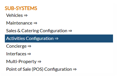 This selection is part of the Property and System Configuration area of Skyware Systems, using the Activities Configuration sub-system. The Activities Configuration screen provides the ability to add Activity Categories (Schedule Types) and Attendants in order to use the Activity Schedule and Attendants Schedule features in the system. You may edit the configuration to suit your Property at any time if you have the appropriate access/authorization.