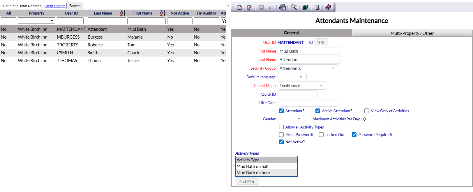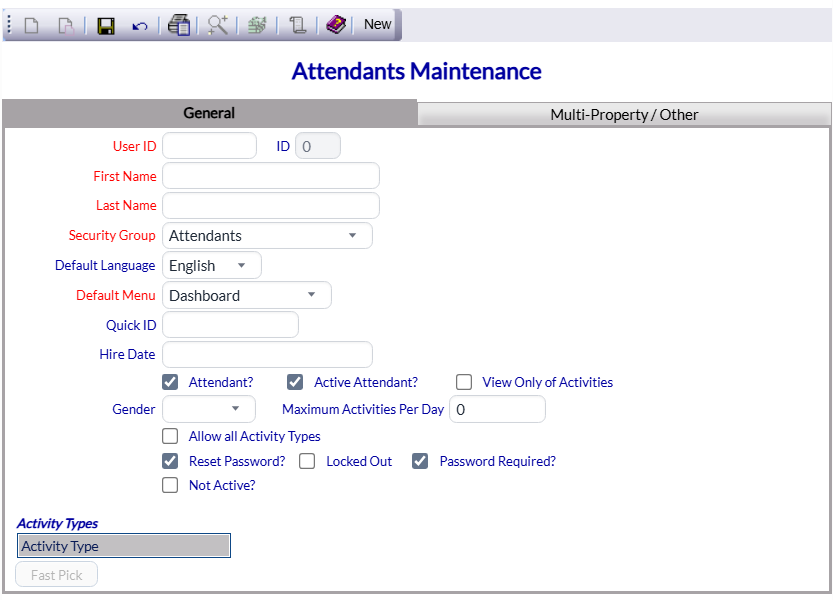 Attendants are your Property employees whom are able to perform specific, specialized activities as a service to your guests. Depending on the facilities available at your Property, these may be your staff that work in your spa area, or perhaps golf or tennis coaches. If you offer a shuttle service, the staff qualified as transportation drivers would be classed as attendants. Any employees that may be specified and scheduled for configured activities will need to be included in your list of attendants. The Attendants Maintenance page allows you to enter your attendants available AND list the activities these attendants are eligible to perform. Once entered, your attendants are considered Users, can log into Skyware and have their own profile within Skyware.