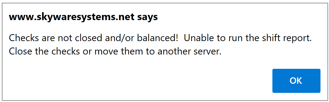 Previously, if there were open checks with balances associated with any of the specific cashiers selected for the report, instead of generating the report, Skyware would show a pop up message stating that "Checks are not closed and/or balanced! Unable to run the shift report. Close the checks or move them to another server", and take you to the Open Checks screen.