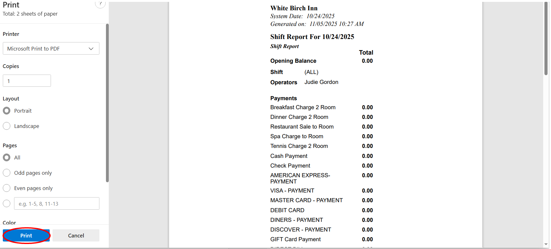 A Print PDF window will also appear, allowing you to print the POS Shift Report.