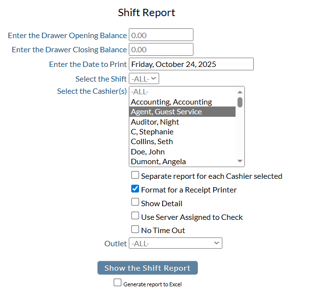 (This is the same when using the Shift Report button on the Point of Sale Restaurant Log In screen).