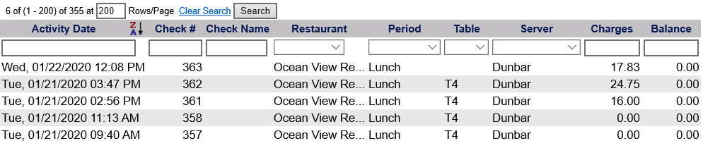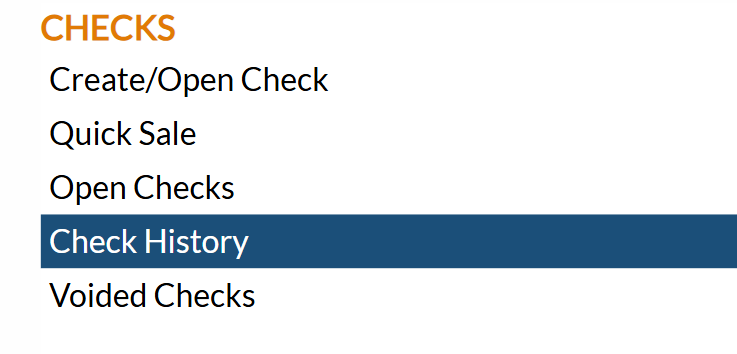 The Check History command (On the main Point of Sale (POS) page, in the main Point of Sale (POS) menu) allows you to view and search through all closed checks in the system.