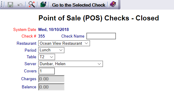 From the Detail View screen, you can also click the Go to the Selected Check button in the local toolbar to open the Restaurant Check screen, to view or modify the check. See also Modify an Open Restaurant Check.