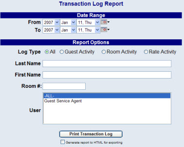 Select the appropriate Report Options for the report. The report can be filtered by guest information activity, room activity, room rate activity, and for a specific guest's last or first name.